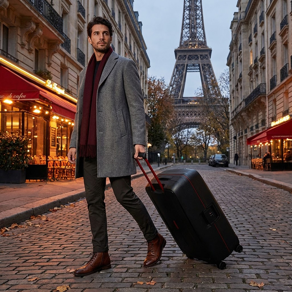 תמונה הממחישה את המראה האורבני המתוחכם בבירת האופנה. הגבר מציג לוק "ביזנס-קז'ואל" מוקפד המתכתב עם העיצוב המודרני של המזוודה, על רקע בתי הקפה הטיפוסיים ומגדל אייפל. המזוודה המצולמת מתאימה במיוחד למדרכות האבן של אירופה בזכות הגלגלים הכפולים והעמידות שלה.