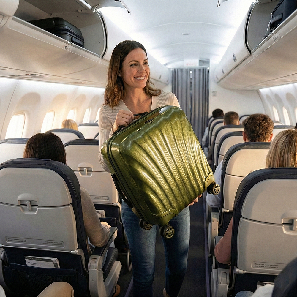 תמונה המציגה נוסעת בתוך מטוס מודרני, מניחה מזוודת טרולי קשיחה בגוון ירוק מטאלי בתא האחסון. התמונה משדרת קלילות, נוחות וחוויית נסיעה נעימה.