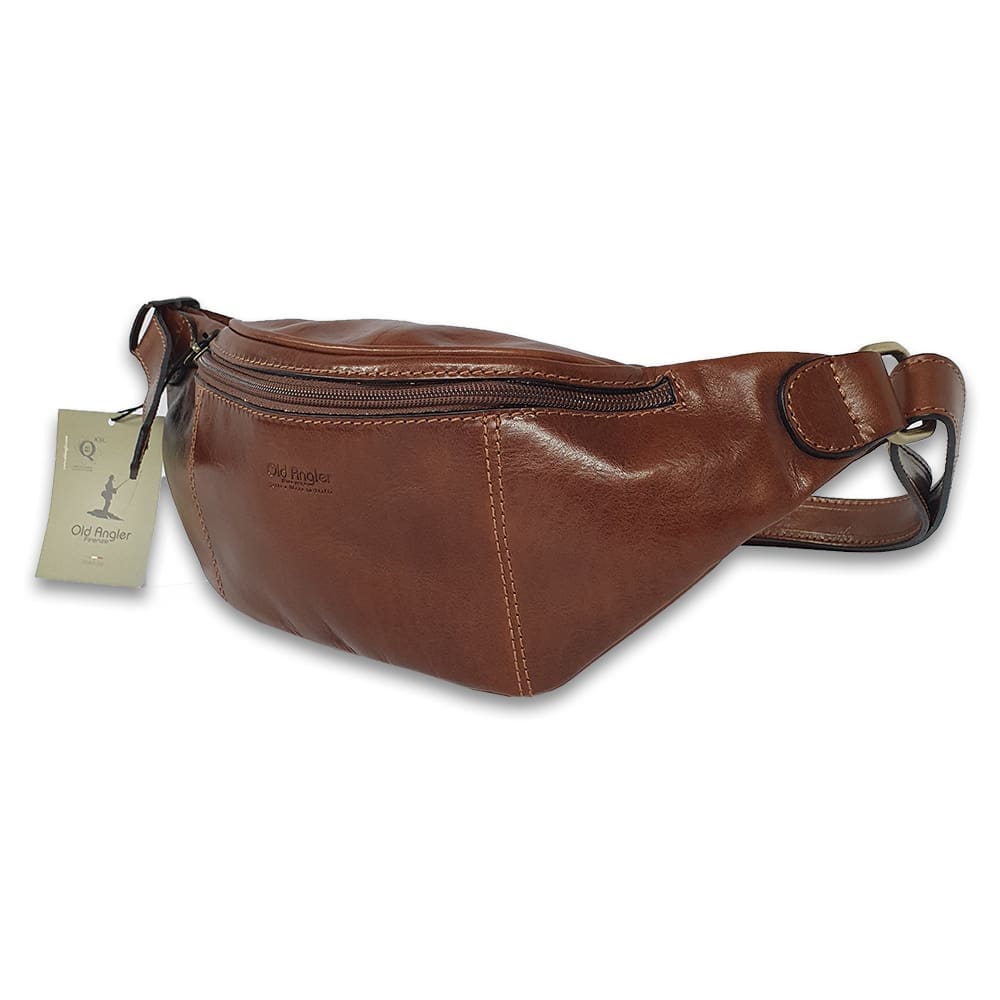 תיק מותן (פאוץ') עשוי עור אמיתי בגוון חום קוניאק. התיק כולל תא מרכזי עם סגירת רוכסן ורצועת עור מתכווננת בעלת אבזם מתכת מוזהב בסגנון וינטג'. מוצר פרימיום מבית המותג האיטלקי Old Angler.