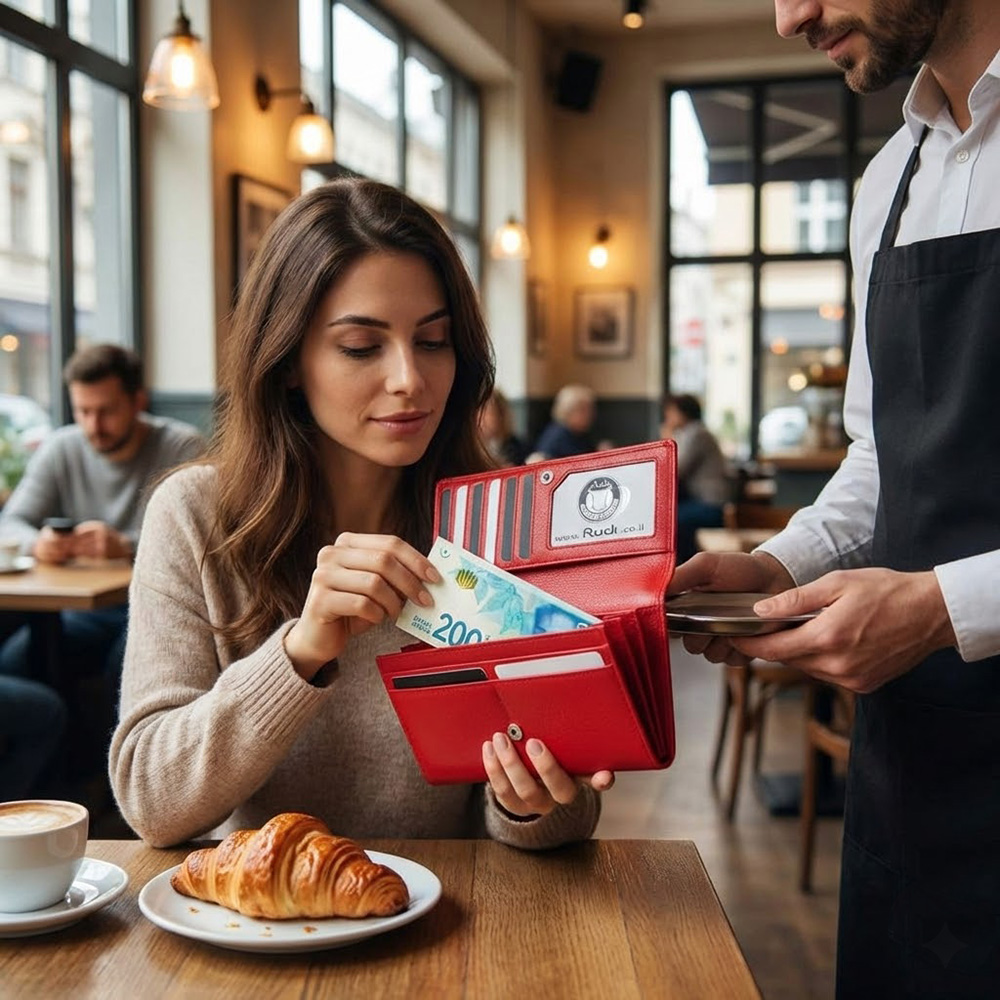 תמונה מרובעת של אישה יושבת בבית קפה, מוציאה כרטיס אשראי מארנק עור אדום.