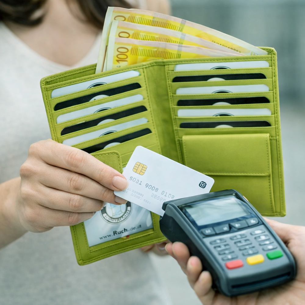צילום תקריב של אישה המבצעת תשלום בכרטיס אשראי מארנק נשים מעור בצבע ירוק.