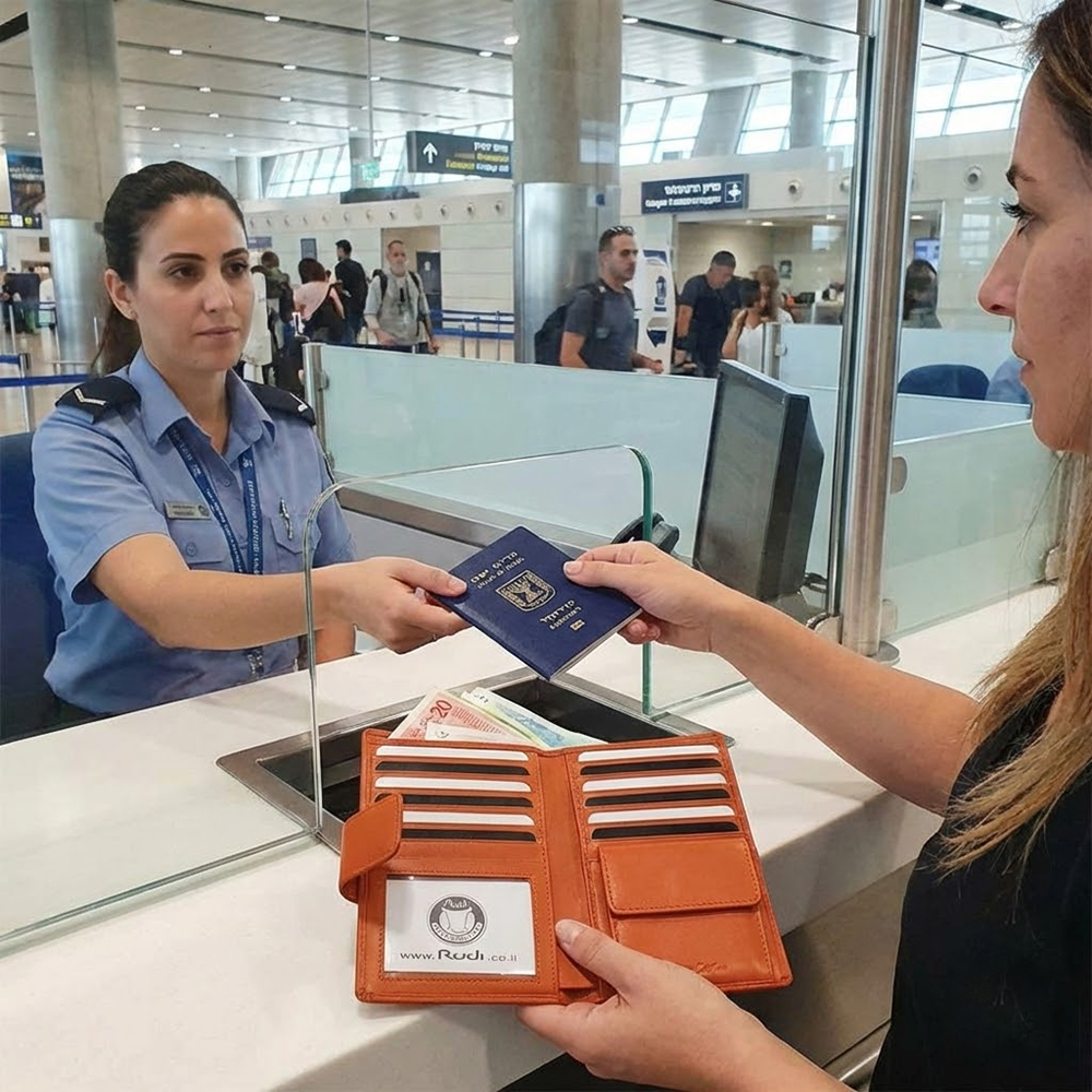 תמונה מציאותית בדלפק צ׳ק אין בשדה תעופה, ובה אישה משתמשת בארנק נשים מעור של RUDI לתשלום.