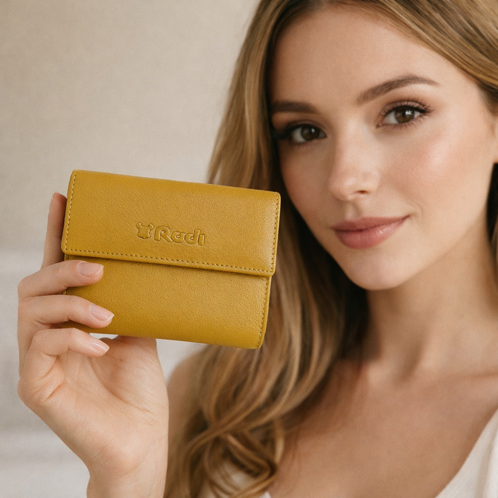צילום מוצר של ארנק נשים מעור נאפה איטלקי בצבע חרדל, בעבודת יד של RUDI.