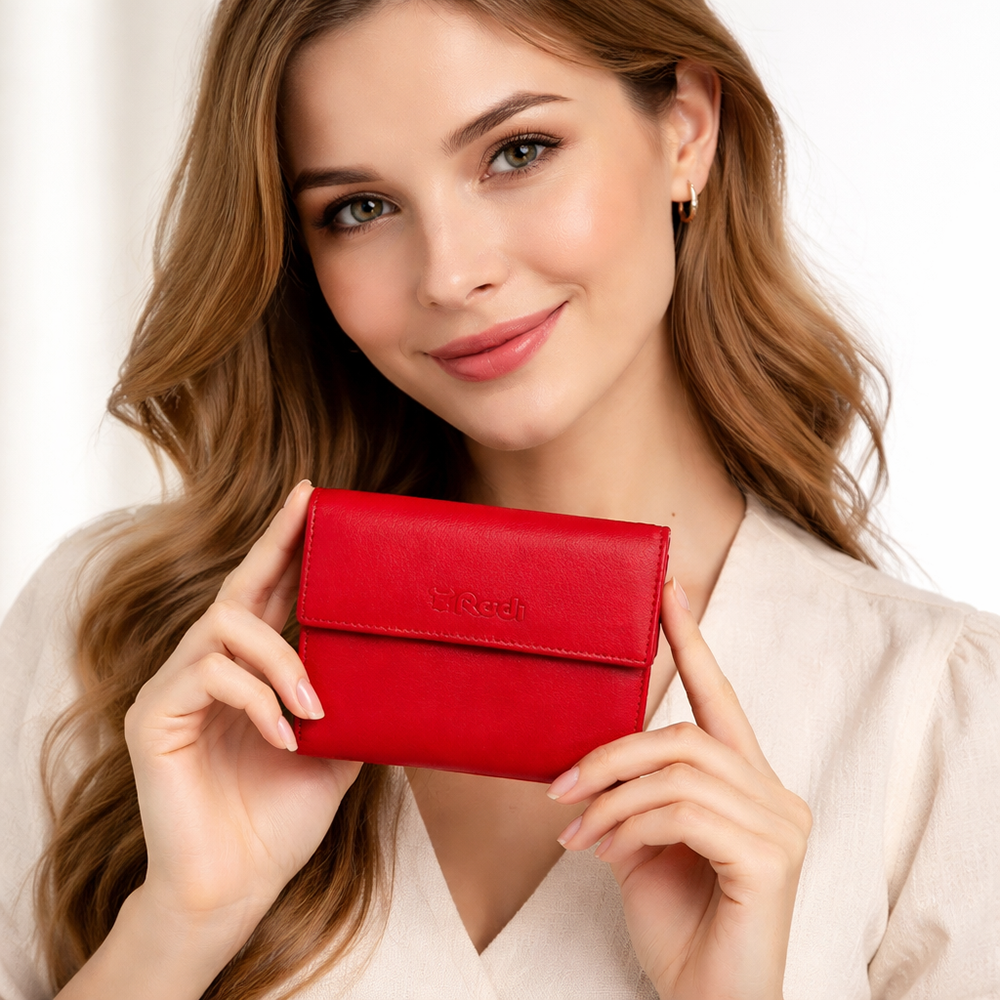 ארנק נשים אדום מעור – דוגמנית אוחזת בארנק אלגנטי