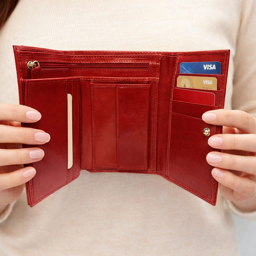 צילום מרובע של אישה אוחזת בארנק נשים אדום מעור איטלקי פתוח.