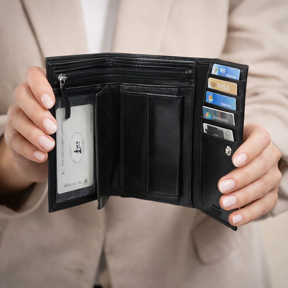 צילום מרובע של אישה אוחזת בארנק גברים שחור מעור איטלקי פתוח.
