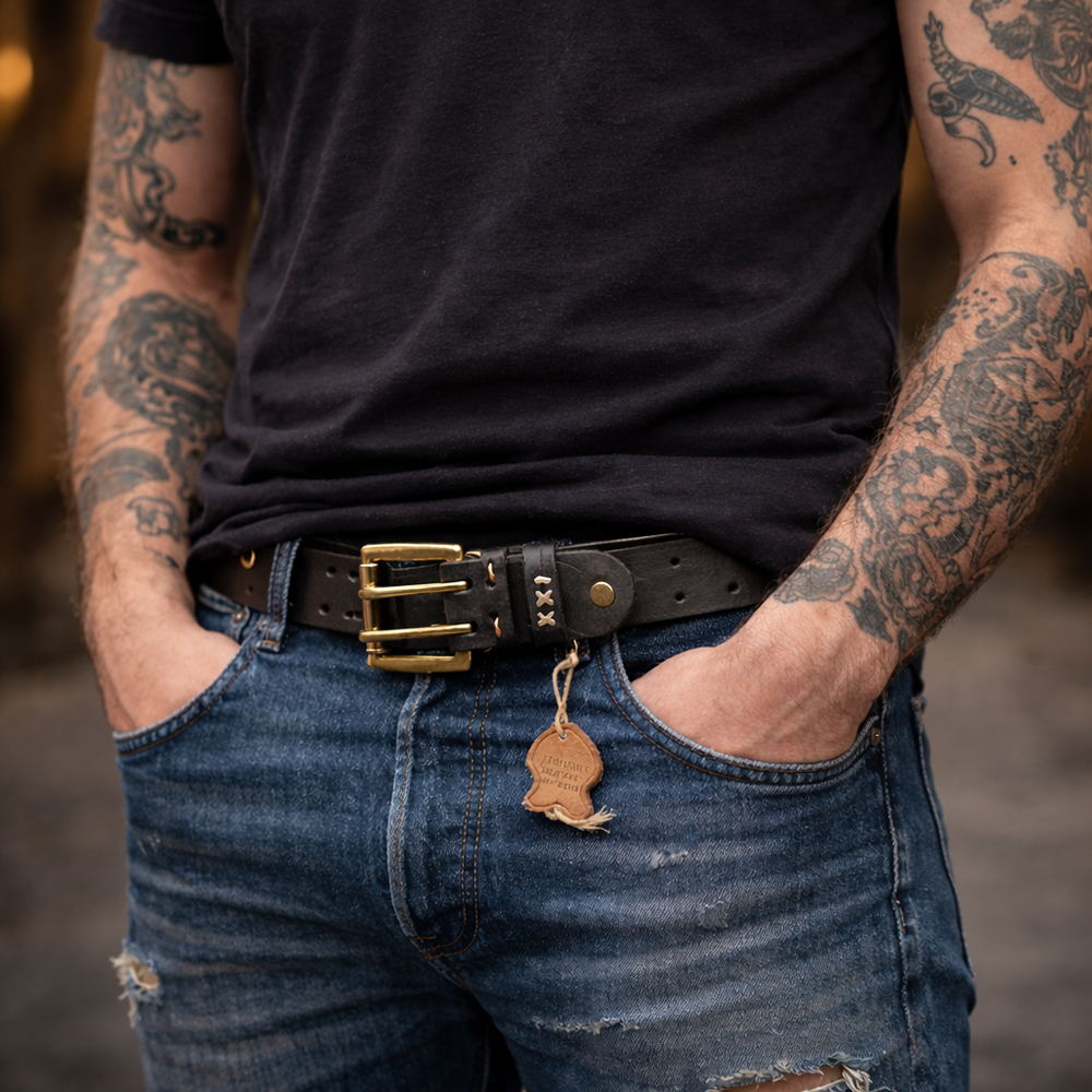 תמונה המדגישה חגורת עור איטלקית איכותית לגבר, עם אבזם מתכתי עמיד ועיצוב נקי.