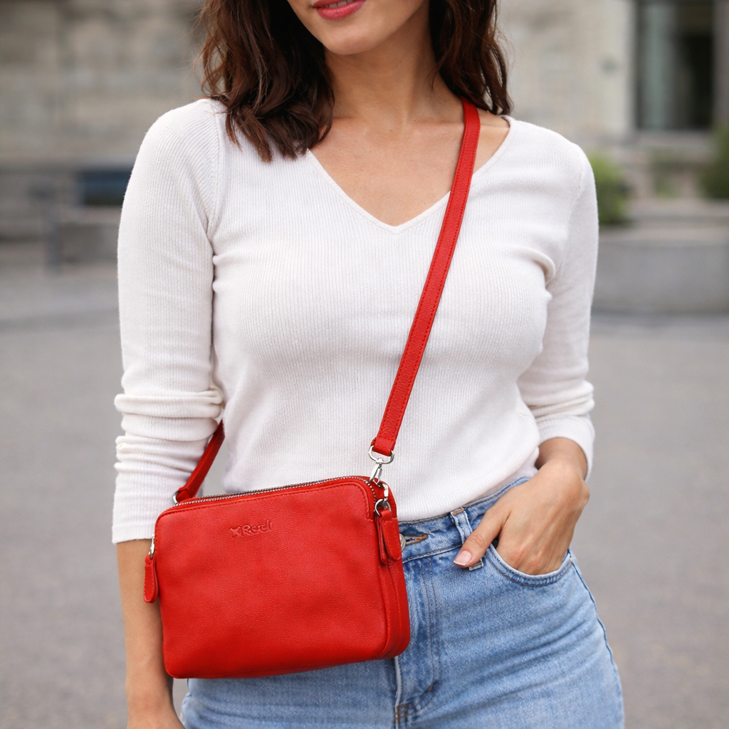 תמונה מרובעת של אישה עם תיק צד קטן לנשים בצבע אדום מעור איכותי.