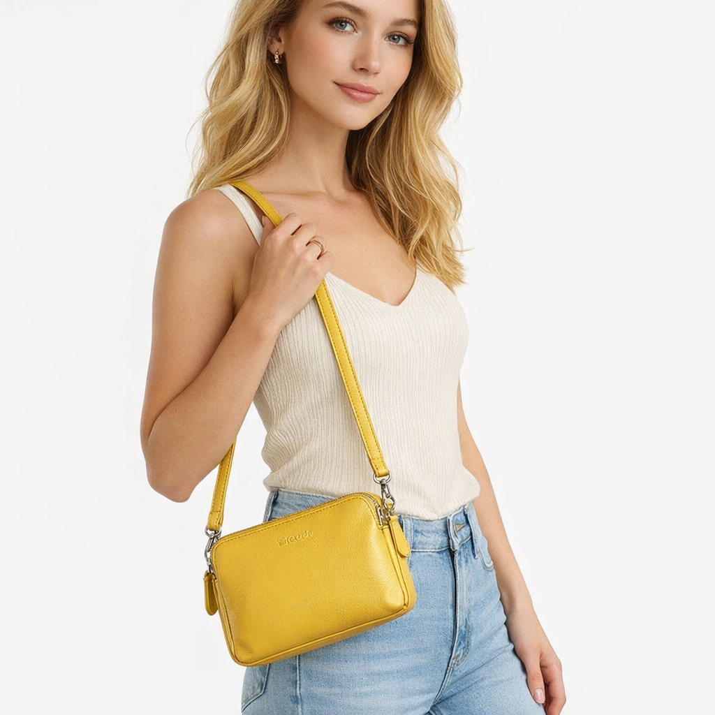 תיק צד קטן לנשים בצבע צהוב על דוגמנית