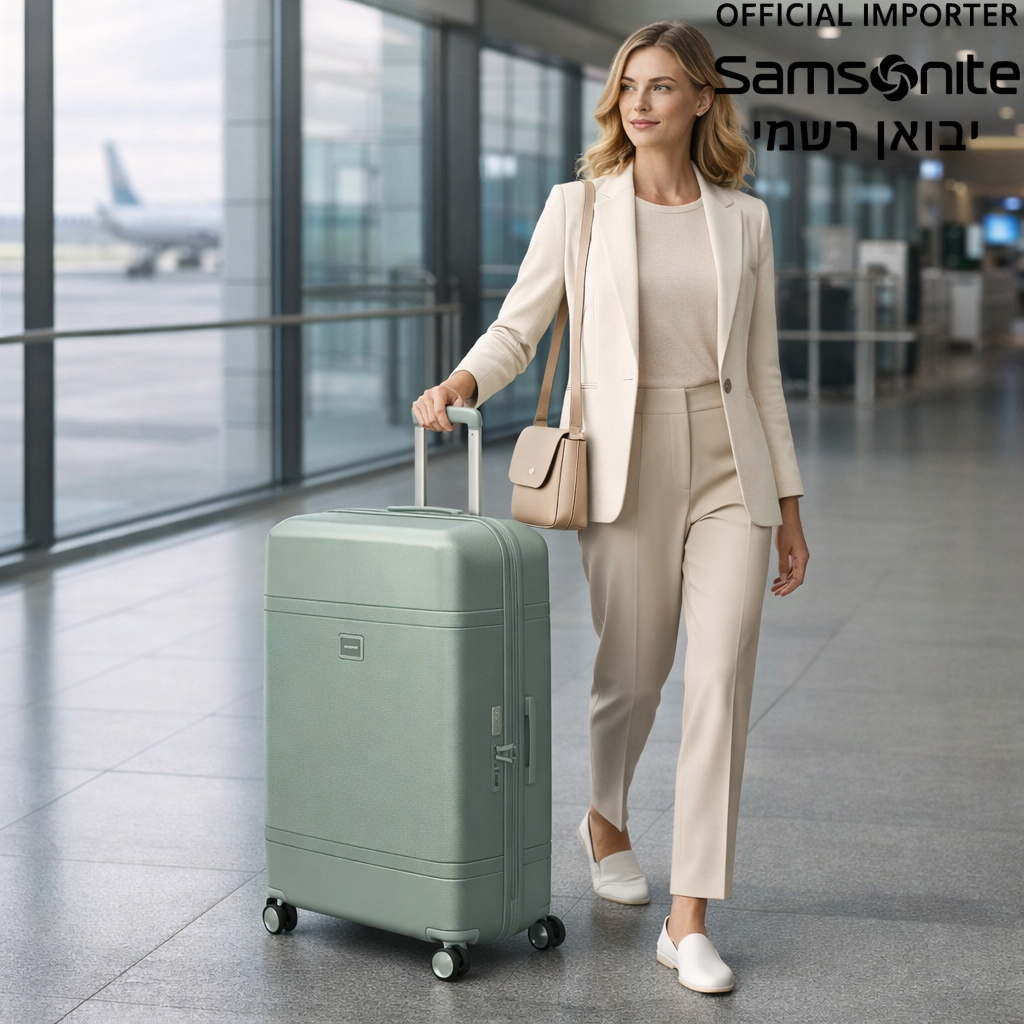 תמונה שיווקית ריאליסטית של מזוודת Samsonite בצבע ירוק עם דוגמנית אלגנטית בשדה תעופה מודרני. המזוודה מוצגת בשימוש אמיתי עם תאורה רכה ורקע נקי, מדגישה איכות, נוחות ועיצוב יוקרתי המתאים לאתר מכירות מקצועי.