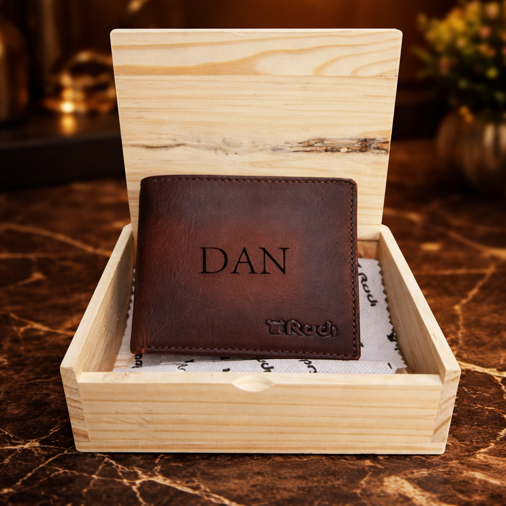 ארנק עם חריטה אישית עשוי עור חום איכותי, מגיע בקופסת עץ יוקרתית ומיועד למתנה ייחודית ומרגשת לגבר. התמונה מציגה מוצר אמיתי עם חריטה לדוגמה המדגישה את האפשרות להתאמה אישית מלאה.