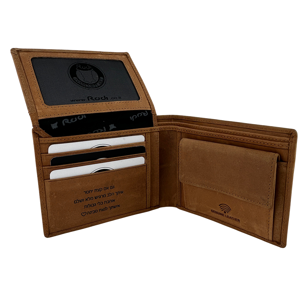 המוצר כולל תא מטבעות, 8 תאי כרטיסים ו-2 תאים לשטרות, ומגיע עם חריטת לייזר מדויקת של תמונה לבחירתך.