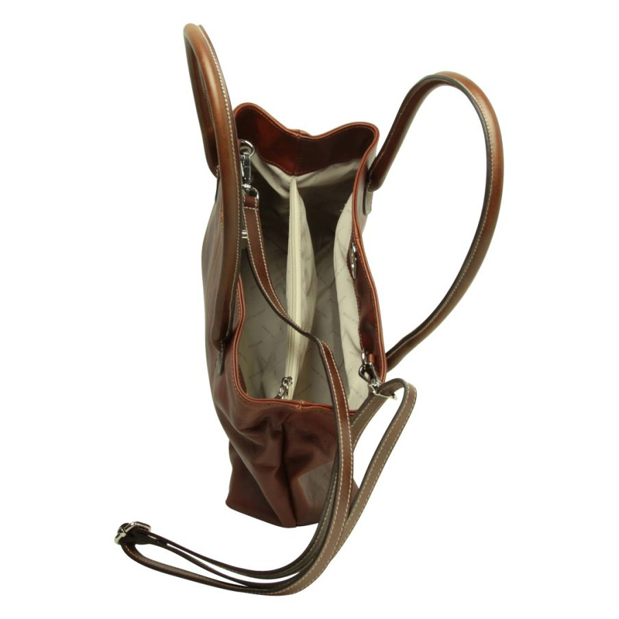 תא מרכזי עם רוכסן ושני כיסים פתוחים – תיק איטלקי מעור חום מהגוני