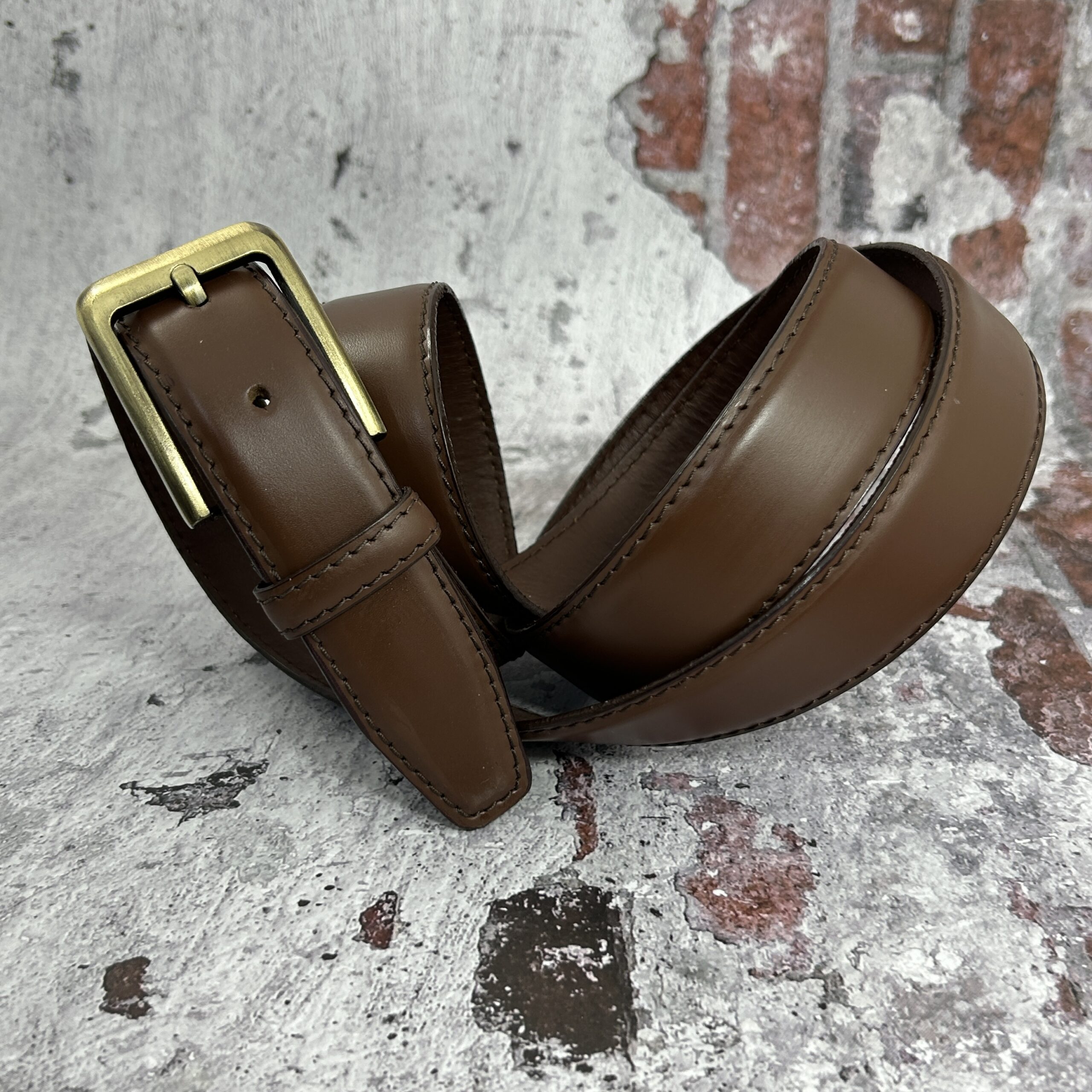 חגורת עור קוניאק לגבר עם אבזם זהב יוקרתי למראה מנצח.