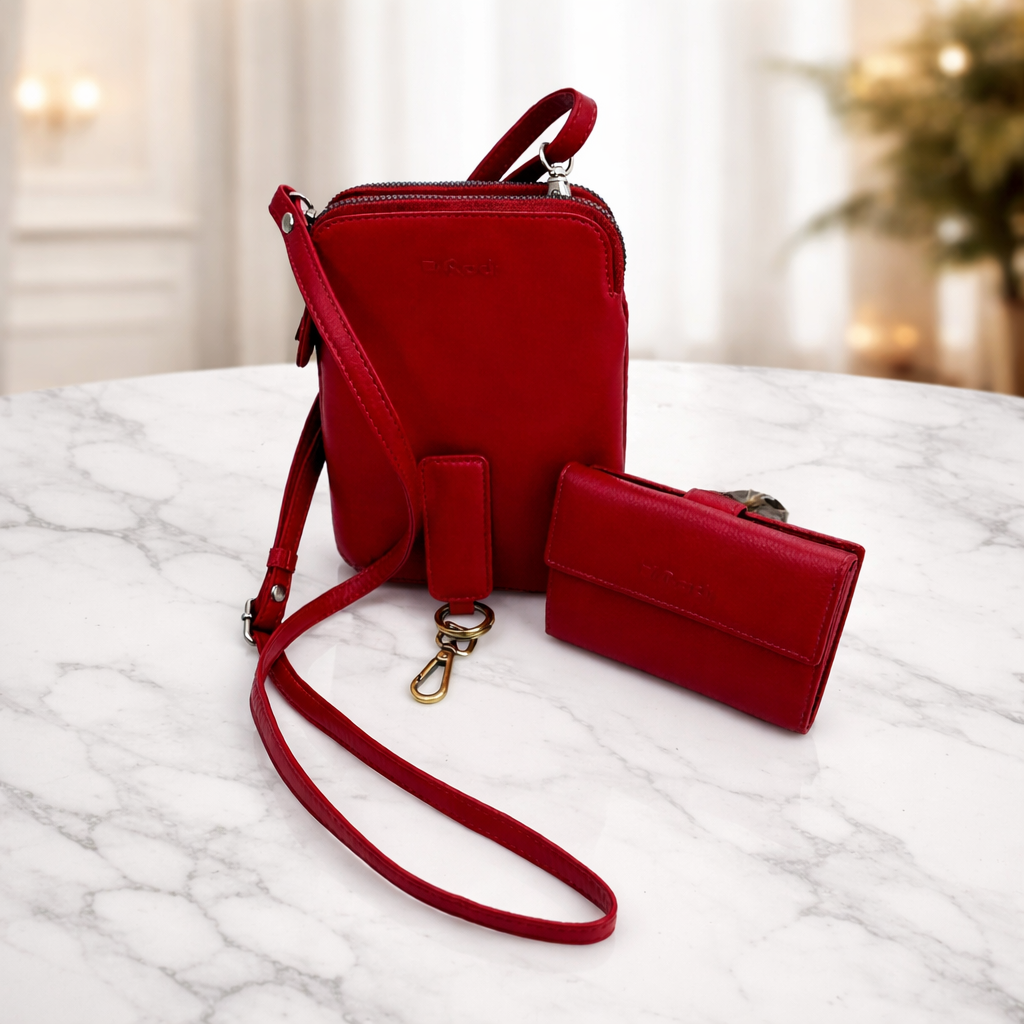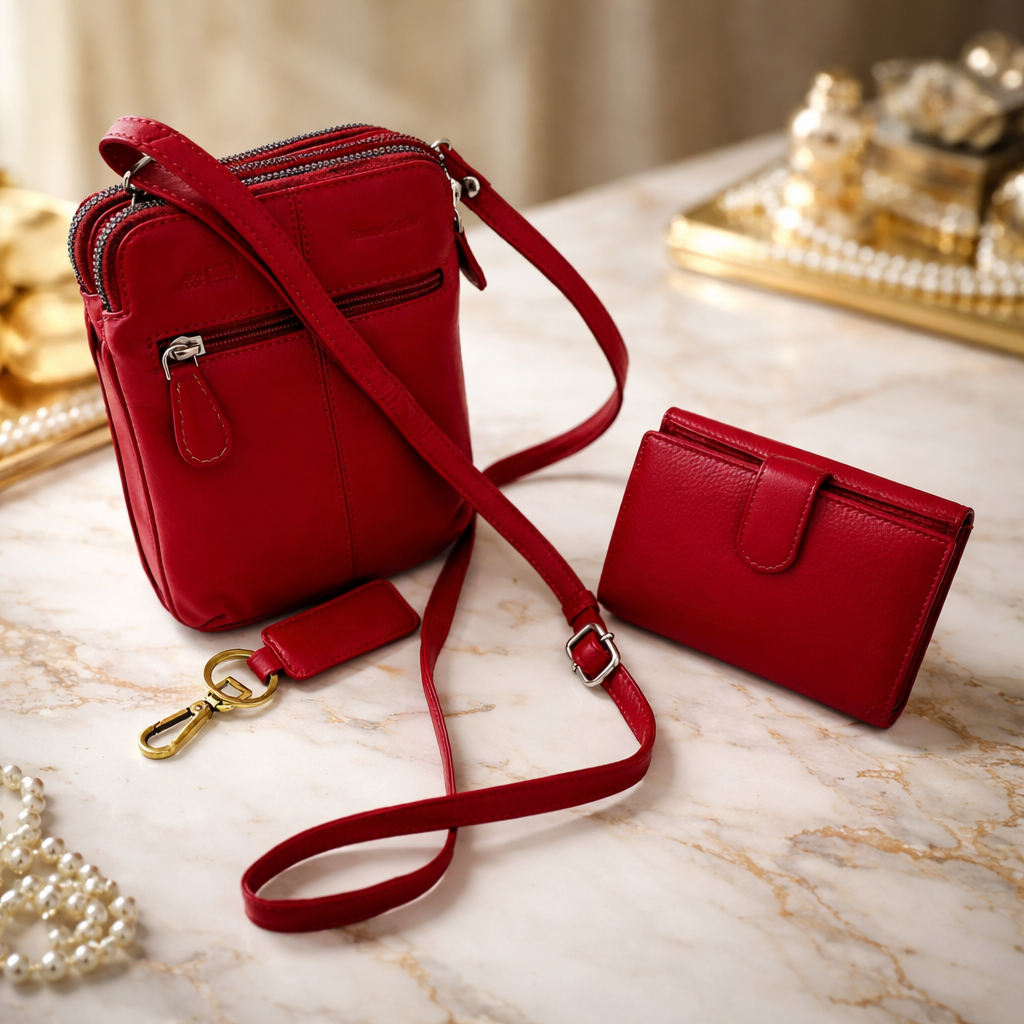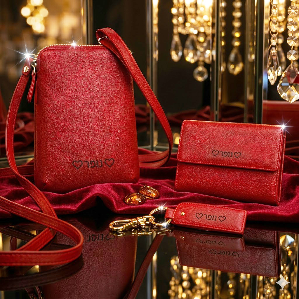 סט יוקרתי הכולל תיק צד, ארנק נשים ומחזיק מפתחות תואם.