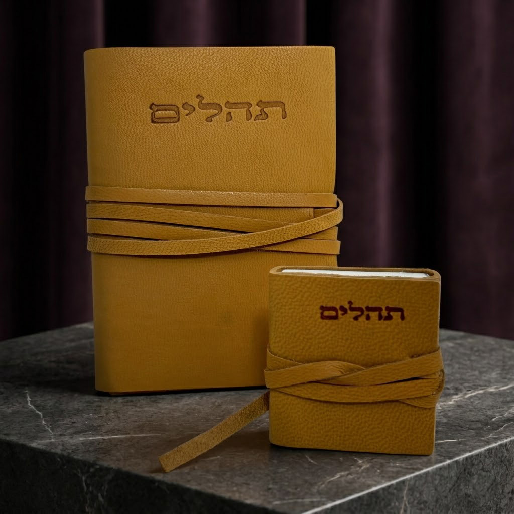 כאשר אנו מחפשים מתנה בעלת ערך נצחי, אנו שואפים למצוא משהו שמשלב בין קדושה לבין איכות בלתי מתפשרת. לכן, **סט תהילים מעור** המשלב שני גדלים משלימים הוא הפתרון האידיאלי עבורכם. מסיבה זו, סטודיו רודי יצר מארז ייחודי המעניק מענה שלם לכל רגע ביום: ספר תהילים גדול ומרשים המיועד לקריאה נינוחה בבית, לצד ספר תהילים קטן וקומפקטי אשר מלווה אתכם לכל מקום שבו תהיו.