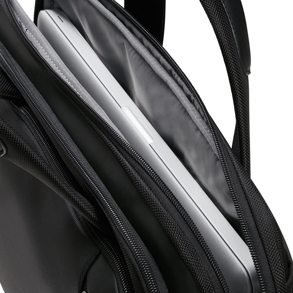 בחלק האחורי נמצא Smart Sleeve רחב. לכן התיק מחליק בקלות על הידית של מזוודת Samsonite, מה שמקל מאוד על מעבר בין טיסות ופגישות.